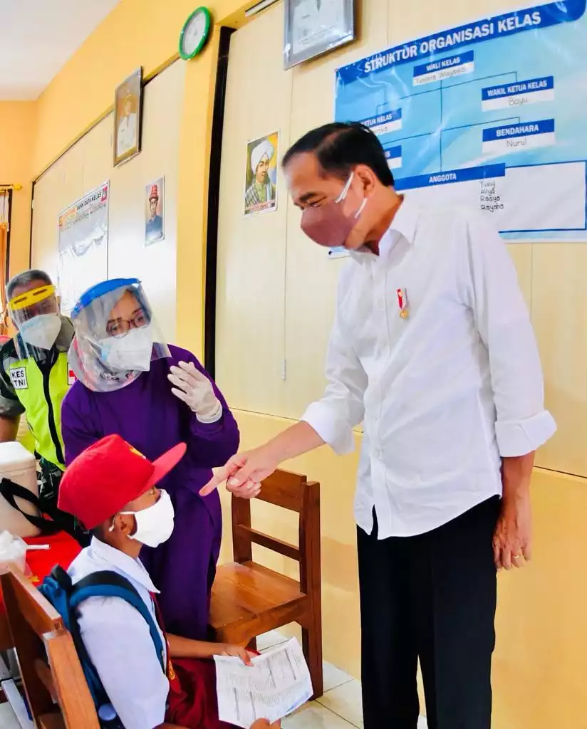 Pada kesempatan itu, Jokowi juga menghampiri anak-anak yang sedang disuntik vaksin Covid-19. Dia lalu bertanya apakah anak-anak kesakitan saat disuntik.
