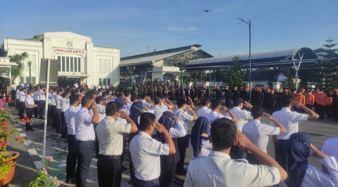 Tahun ini, PT KAI Daop 6 melaksanakan lagi gelar pasukan di Stasiun Yogyakarta, Jumat (22/4/2022). Ini untuk menindaklanjuti PT KAI yang telah menetapkan masa posko Angkutan Lebaran tahun 2022 selama 22 hari, mulai 22 April 2022 sampai 13 Mei 2022.