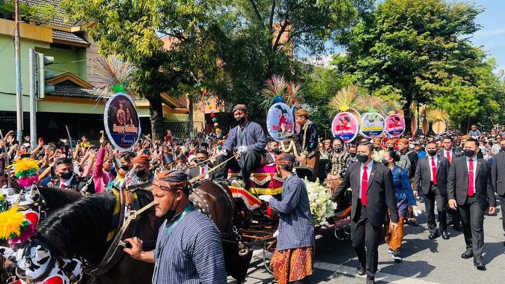 Pasangan Kaesang Pangarep dan Erina Sofia Gudono melakukan kirab untuk menuju Pura Mangkunegaran. Kaesang dan Erina tampak mengenakan pakaian dodot basahan adat Solo.