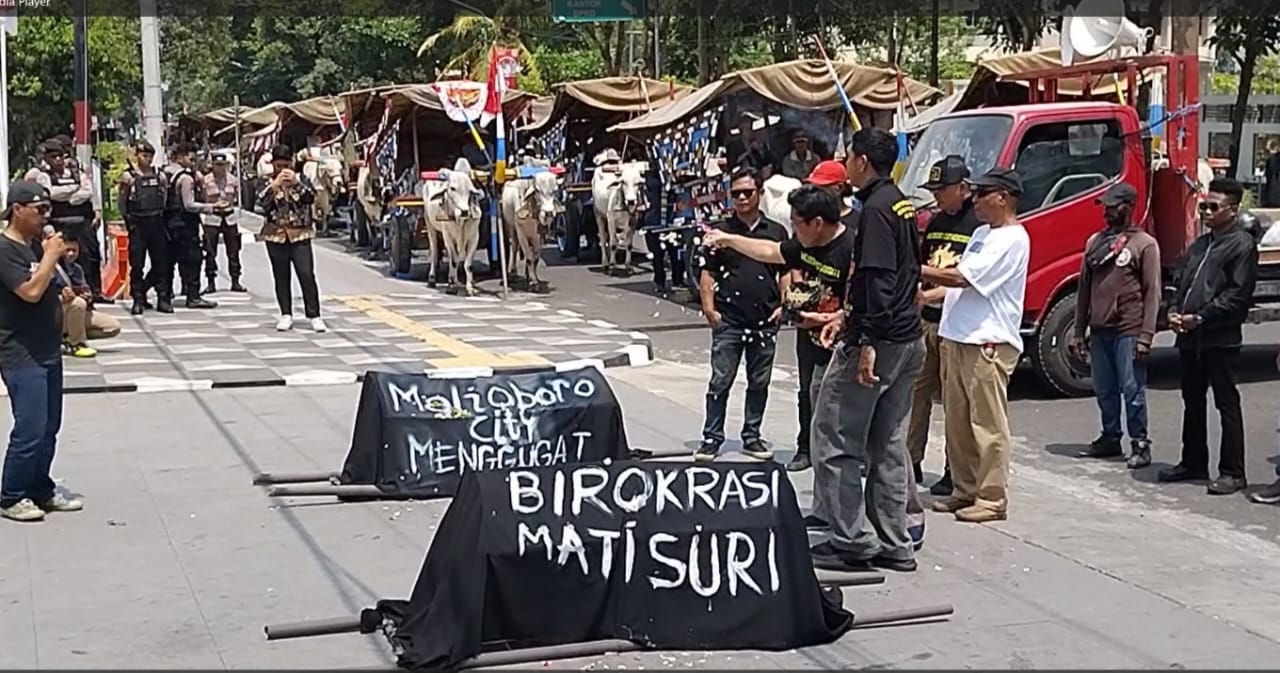 Aksi unjuk rasa diwarnai dengan pembakaran dua keranda bertuliskan Malioboro City Menggugat dan Birokrasi Mati Suri.