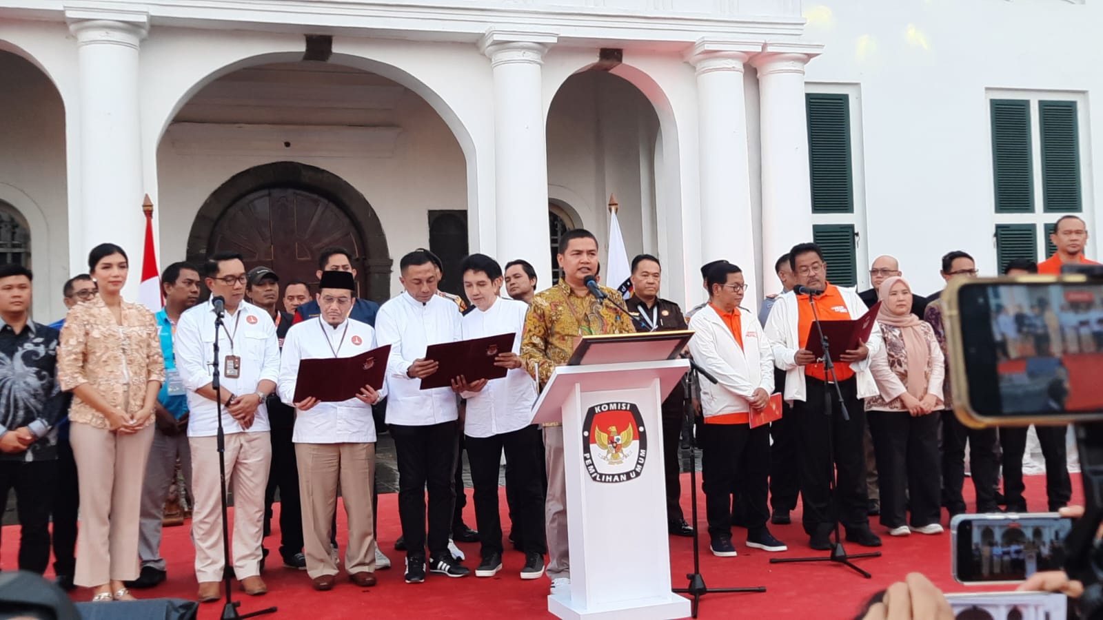 Ketua KPUD Jakarta, Wahyu Dinata, memandu pembacaan naskah, yang kemudian diikuti oleh ketiga paslon Cagub dan Cawagub Jakarta.